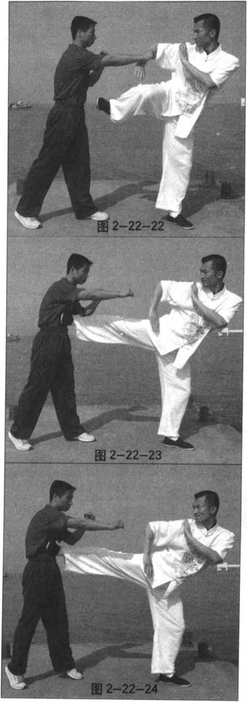 接下来,我在左手继续外挡 其右臂的同时,迅速向上进左 步,准备攻出右脚(图2-22-3 );