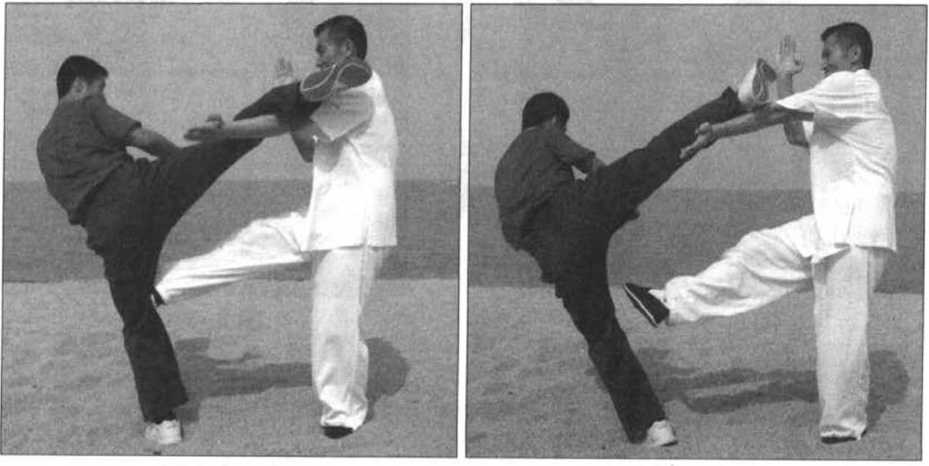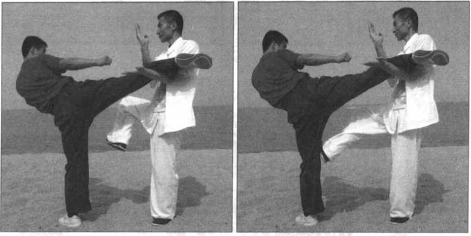 我应在对方的腿力未完全发出前 便需将其腿控制住,左臂向上掀抬其 右腿要连贯、有力,右脚向前扫(踹) 其膝关节要准确、凶猛,一招制敌(可 由此彻底摧毁对方的下肢攻防武器), 整套动作一气呵成。