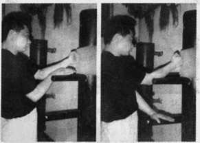 练习者双手伏住木人桩两手作圈手三次然后自下而上琶力托木人桩两手臂然后化为外耕手。(编辑陈能)