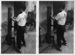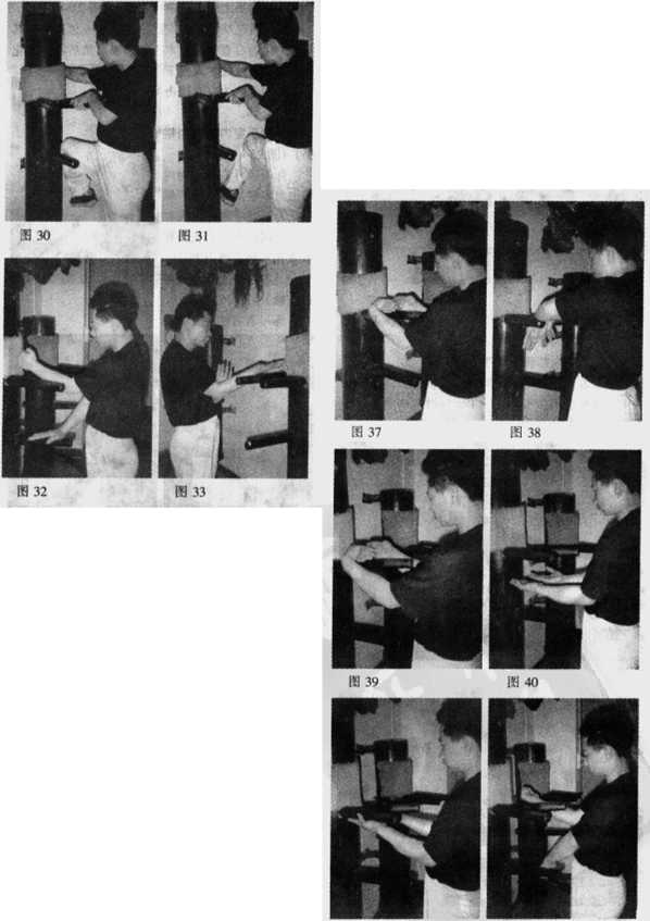 手化为外蝶掌击向木人桩左外侧其后移正马化左外膀食住木人桩右外臂。