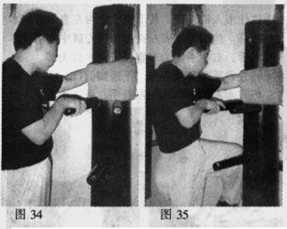 〔坠手扣颈起膝,下踱脚1(图34-36)