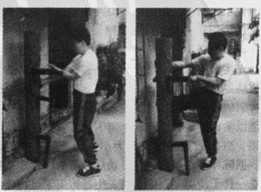 然后扣搂卜坠其右住撞化为扣手扣住木人桩颈部猛下下,同时练习者起右膝然后下蹬脚。