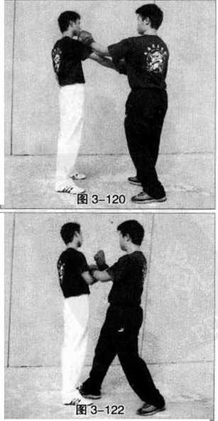 我右拳继续向上挑拉用来减轻敌方的抓握力度(图3-118)