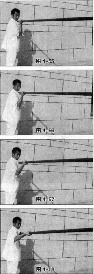 在呼气的同时两手适当用力将棍向前刺出(图4-56)