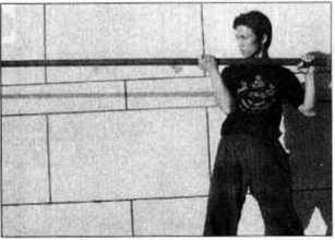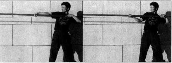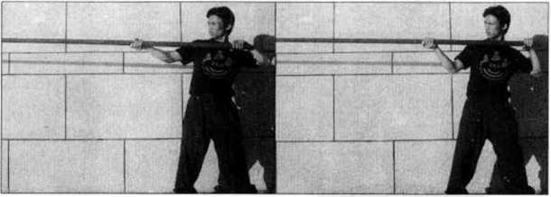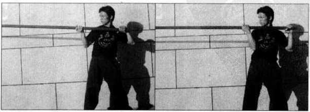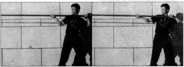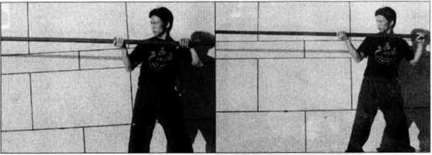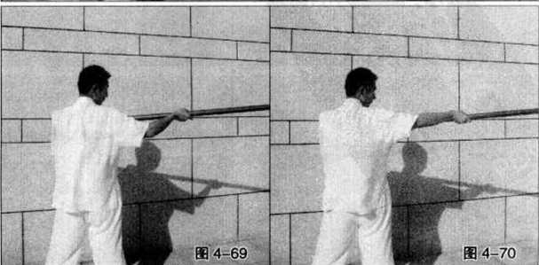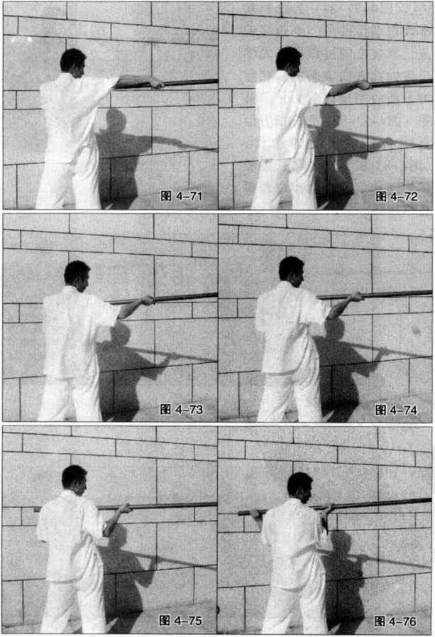 出时的另一个角度示范即先将长棍向前方沿直线快速刺出然后再收回至体前为止。其中(图4-66?71)是在呼气的同时向前方直线攻出的动作(图4-72?76)则是将长棍收回的动作。