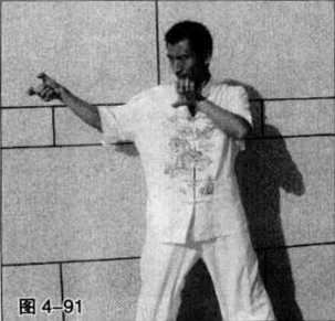 (图4-77?87)为枪棍基本攻击动作的另一个角度示范其攻击的过程仍是先将长棍向前方快速刺出然后再果断收回至体前为止。其中(图4-77?82)是向前方沿直线快速攻出时的动作(图4-83?87)则是将长棍收回的动作。整个动作过程要自然流畅。