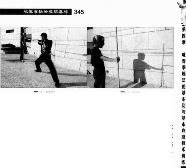 咏春季相法的基本与基本攻防技术调练咏春季相法的基本与基本攻防技术调练228-232)是我的长棍接触敌方的武器并将其武器快速向下弹击的动作而(图4-233?235)则是我利用长棍防御完后回收的动作。