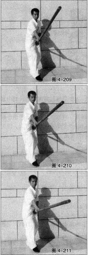 我直至将长棍向下弹至膝关节的高度为止(图4-214)至此便完成了向下的防御动作°
