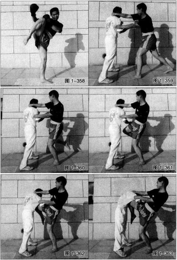 在对抗泰拳的横撞膝之前我们必须先了解其攻击路线与攻击特点(图1-354?358),做到知己知彼。这种攻击性膝技的实施关键是在用上肢控制住敌方的上体后再用猛然转体的力量攻出右膝或左膝因此攻击力极强(图1-359?363)。