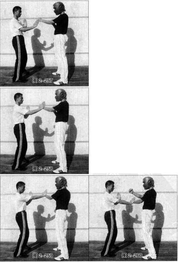 (-)右侧动作示范实战动作要领我由正身马开始(图2-253)敌方先挥其右拳向我攻来(图2-254)我立即用左手去拍击敌方的右前臂外侧(图2-255)我左手轻快的拍防动作破坏了敌方的用力与攻击方向(图2-256)第二章咏春拳手脚配合攻击法第二章咏春拳手脚配合攻击法第二章咏春拳手脚配合攻击法第二章咏春拳手脚配合攻击法接下来敌方乂用其左拳向我上盘攻来(图2-257)