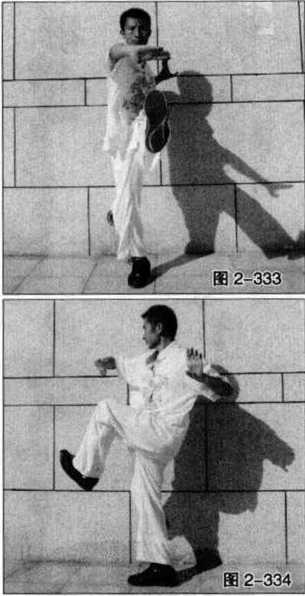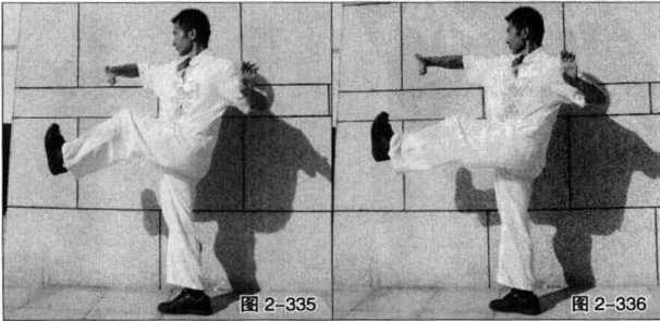 (图2-334?336)是我的最后的右掌与左正蹬腿同步攻击时的侧面示范动作。记住此时我的打击动作必须与左手上的后拉动作配合好。