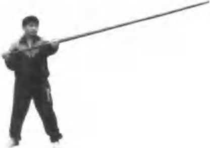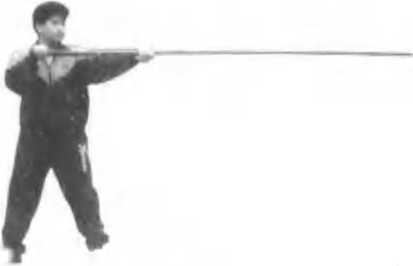 依上势.左P着??,脚向前迈上一步成二宇钳阳嗎, 左手回拉.右手以肘底劲向前tt准棍尾,使棍梢向下,目忆 盯住棍梢(见图3?>