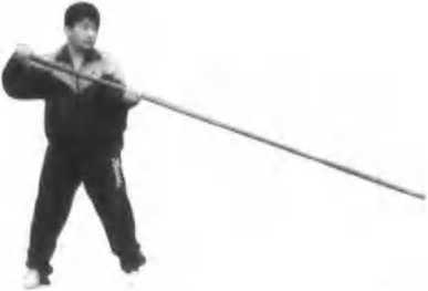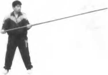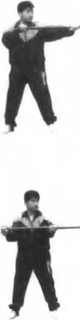 依上势,仍*钳叹马,仅手用力将挹收至身正舫两 手与柄同宽(双手留中>.H光盯住椹梢 < 见图223>