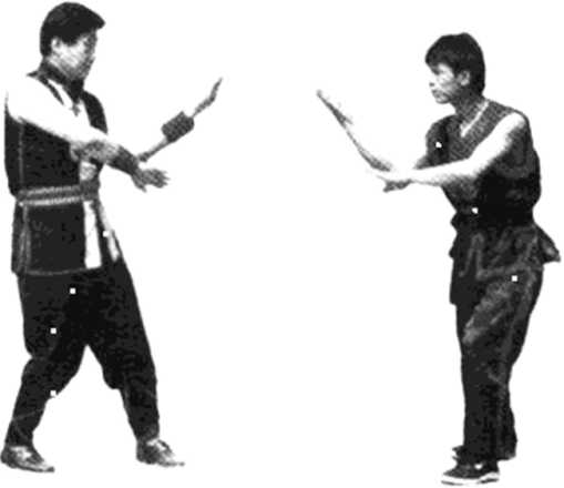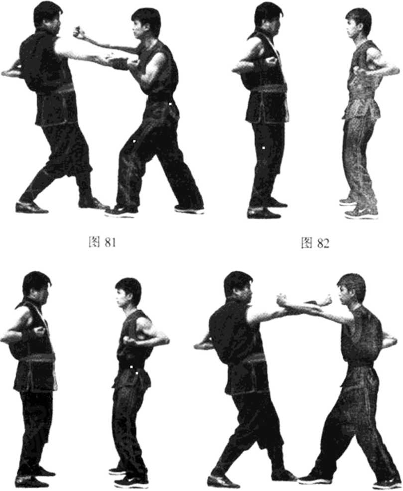 甲方上左步以右直拳向乙方上路进攻,乙方即以左摊手 摊甲方右直拳,同时以右直拳打向甲方面部。这时要求乙方 身体转向左方,以侧身对敌,这样右手的攻击距离可远一些。 这招式也称抢内兼打(见图8】),要求反复地练习,使自己的 腰桥马达到最佳的状态。甲乙退复原位后还原(见图82)。