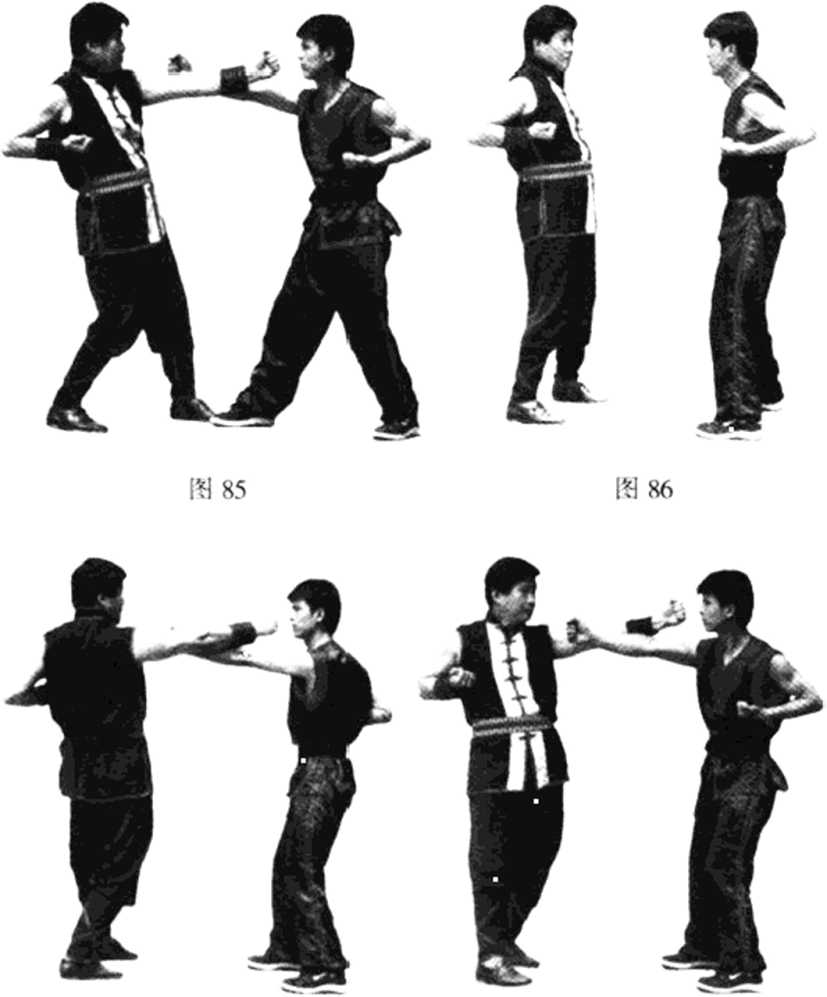 【例6】抢外帘手法训练。甲乙双方站钳阳马对峙(见 图86);当乙方以左冲拳向甲方进攻,甲方也及时以右冲拳 从乙方桥面打出,甲方的右冲拳将打到乙方时,身体突然左 转,使右手攻击的距离增长(打在乙方的脸部,见图87); 当乙方转冲右拳攻击时,甲方又及时发左冲拳从乙方桥面打 出,当冲拳快打到乙方时,身体再突然右转,使右冲拳的攻 击距离增加(打在乙方的脸部,见图88)。