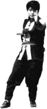 在甲方的右摊手上。这也是咏春拳单黏手的定式手法,在未 熟习其他手法之前一定要以这种手法去练,要求双方都采用 钳阳马,要腰马稳、沉肩肘和以双眼注视对方(见图%)。图96 图97【1式】甲乙双方以大钳阳马对峙,乙 方以左冲拳打向甲方中路,甲方及时以右摊 手拦截,此时乙方即把打出的左拳化伏手伏