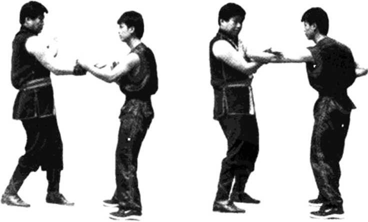 图95十六式单黏手主要是训练手臂的放松 和守中(也就是肘部归肘),在进攻的同时 又以肘部保护自己的心窝、肘底守住双肋, 靠封手稳守住自己的中路,不给对方有攻 击的破绽,在练习中,每次的攻击都要求 做到留中守中。练习十六式同时也要求使 手臂练出灵活的寸劲和敏感的触觉。