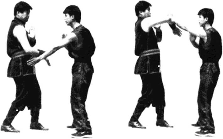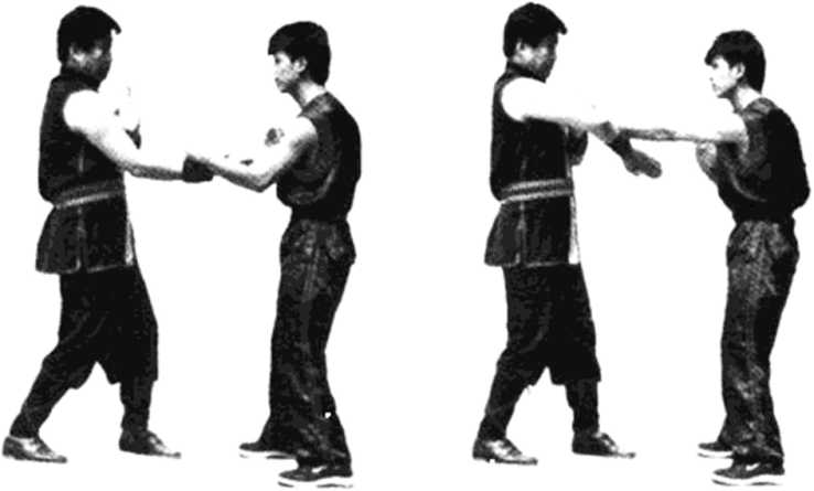 【8式】当乙方左偷漏手被甲方的拦手化解后,乙方的 左标指大摆,直标甲方胸口,甲方即以中膀手化解(见图 103) 〇