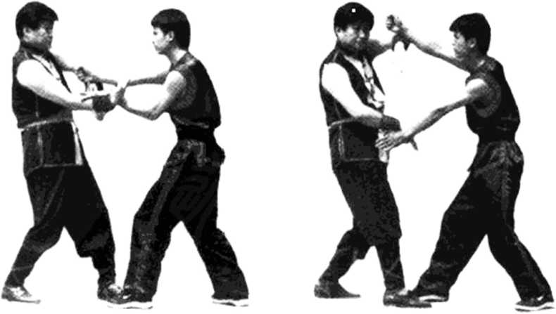 【9式】乙方左桥手偷沉后,用外横掌向甲方脸部打去, 甲方右桥手内旋以高膀手消解(见图126)。