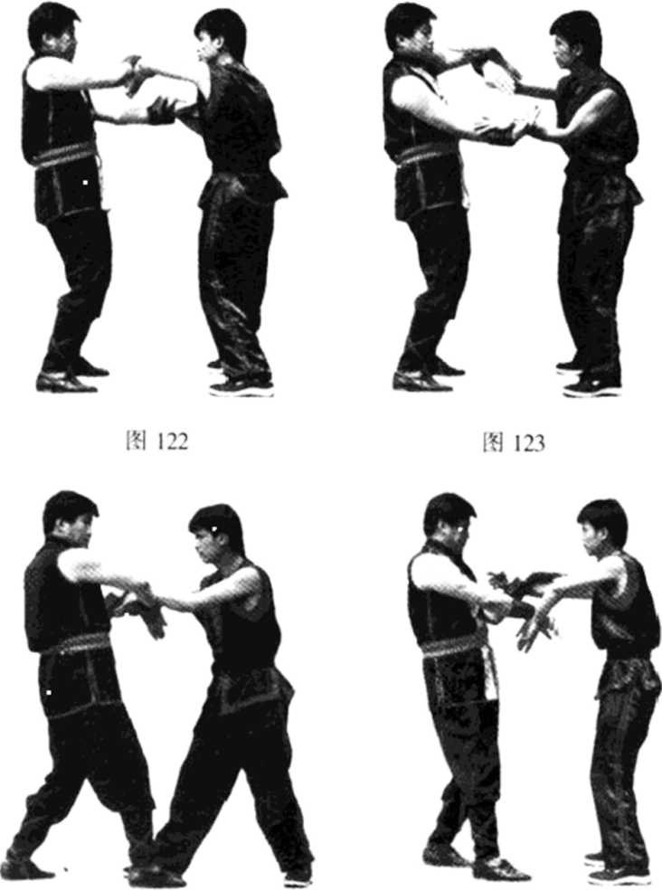 【8式】乙方的右腕以弓背掌向甲方的中路佯攻;甲方 的左手归肘,掌部稍上转(仍是摊手)消解乙方的弓背莩进 攻(见图125)。