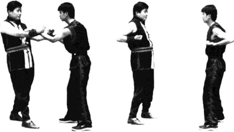【31式】甲方双手向左转,左手由上而下转摊手,而右 手转伏手;乙方双手跟随甲方双手转左手成摊手,右手成伏 手,此式还原(见图148)。图148图149【32式】收式,双方双拳收回将台后还礼(见图149)。 以上为定式32式黏手训练,爱好者可先按部就班地学习, 待练熟后,再在师傅们的正确指导下,去进行化拆的练习, 以及不定式黏手的应用。图148图149