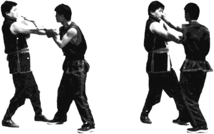 以左手摊住乙方右拳的内帘(见图186);当甲方以左手摊 住对方来拳时,突然转下拉手将乙方右拳桥手下拉,同时打 出右抓手卡乙方的脖子(见图187)。