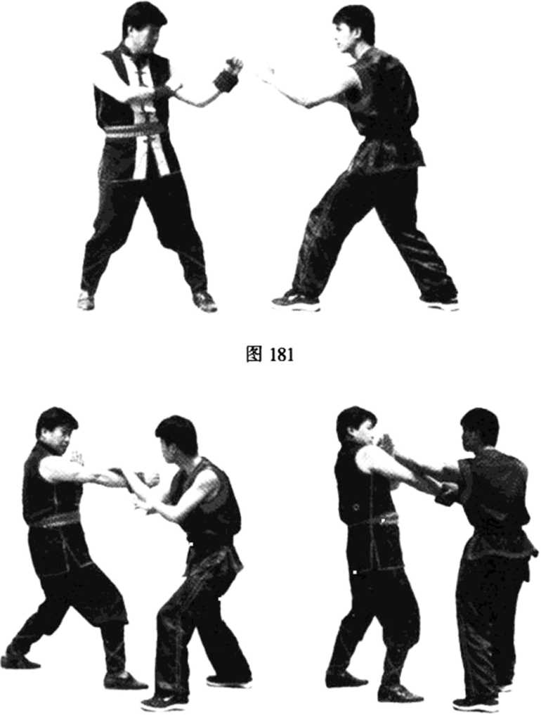 【例10】摊手化直漏手打。双方对峙准备格斗(见图 181);甲方以右直拳向乙方中路进攻,乙方即以右摊手摊截 来拳(见图182);乙方左护手变拳打向甲方的脸部(见图