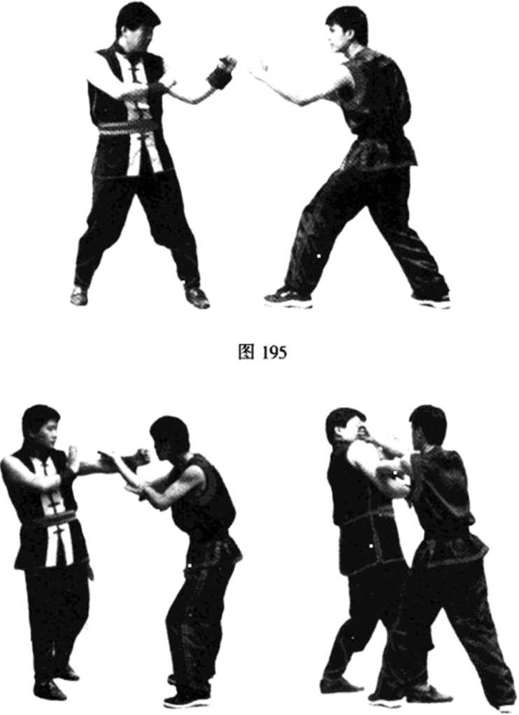 (见图196);紧接着乙方逼步,左护手变弯弓射箭手封甲方 双肩,而右摊手变直拳打在甲方的脸上(见图197)。图196 图1972.摊膀手转膀手系列膀手是咏春拳在实战中运用得较多的和十分典型的一种