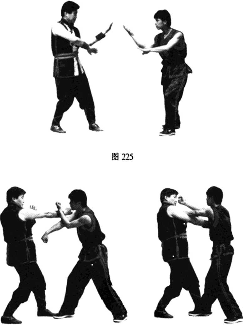 图226 图227【例2】内拦手化掌打脸。双方对峙准备格斗(见图 228);甲方上马用右拳攻击乙方上路,乙方的护手立即变拦手抢内帘位(见图229);然后乙方的左拦桥手可变拍掌在 内帘横打甲方的右脸部(也可变连环扣打,见图230)。