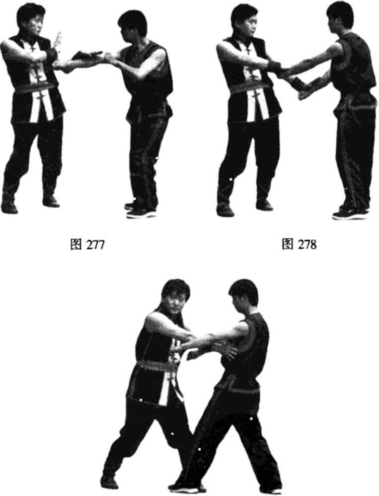 甲方即以左手伏住乙方的右直拳 (见图277);这时乙方又以左直拳向甲方攻击,甲方再以右 伏手伏住乙方的左拳(见图278);这时甲方以双伏手内扣并圈腕抢内帘,直击乙方双肋部(注:这手法在练4时要小 心,有一定的危险性。见图279)。图279【例7】伏手抢攻闯中心。双方对峙准备格斗(见图 280);乙方以左手标指手向甲方中路攻击,甲方即迎上并以%图280左伏手从乙方标指手的外帘伏下,同时右护手变直拳攻击乙 方的胸或脸部(见图281)。图280