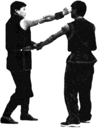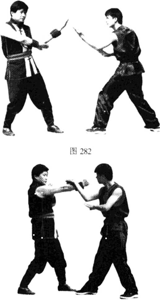 【例1】摊接伏防锁喉指(阴铲手)。双方对峙准备格斗 (见图282);甲方以右冲拳向乙方中路攻击,乙方即向左闪 侧一步,以右摊手摊住甲方打来拳外帘(见图283);乙方 在护手变伏手伏压甲方右拳的关节位,然后右摊手化阴标指 攻击甲方的脖子(见图284)。