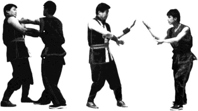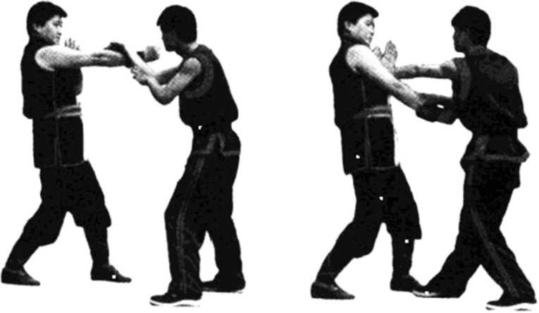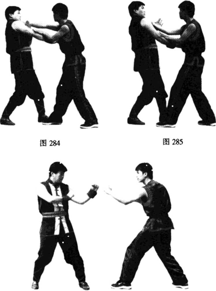开式与上例同,乙 方的左护手伏住甲方来拳关节位,右摊手化阳标指手攻击甲 方的咽喉部位(见图285)。图286【例3】摊防拉手锁喉指。双方对峙准备格斗(见图286);甲方用右冲拳向乙方中路攻击,乙方即以右摊手摊住 甲方的来拳(见图287);乙方摊手突然转拉手下按甲方的 桥手,这时乙方的左掌直打甲方的胸部(见图288);在乙 方左掌直拍甲方胸部时,又突然窜起,成标指攻击甲方的喉 部(见图289)。m 287 m 288