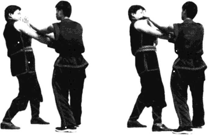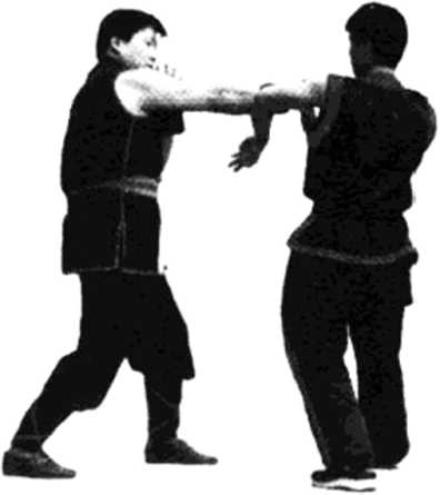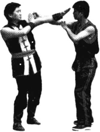 喉。双方对峙准备格斗(见 图290);甲方用右直拳向乙 方中路进攻,乙方以左膀手 拦截(见图291);乙方右护 手下按甲方的右拳,左手化 挂拳打在甲方的胸部上(见 图292);当乙方左挂拳打在 甲方胸部时,又突然将左拳 化指向上直插,以阳标指手 封甲方的上路(见图293)。