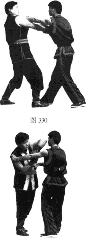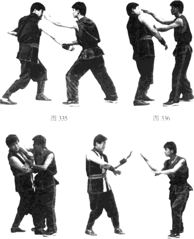 左冲拳即变伏手自上而下压着甲方的右臂,右手迅速化标指 手插向甲方眼部,形成第二次打击(见图336〉;若甲方以 左手防打,乙方及时以左手按甲方左掌,再发后标指手;乙 方的右标手攻击成功后又变批肘,以右肘横批向甲方颈部猛 击(长桥手化短桥手)形成第三次打击(见图337)。