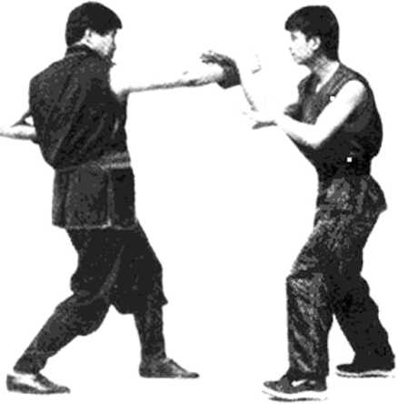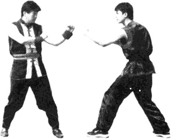 (综合手法)。双方对峙准备格 斗(见图333);甲方上左马用右拳向乙方进攻,乙方及时 出右摊掌把甲方打来的右冲拳摊住(见图334);然后乙方 的右摊掌立即变擒拿手扣住甲方打来的右冲拳用力下拉,左 护手化直拳猛打甲方的脸部(见图335)。在乙方得手后,
