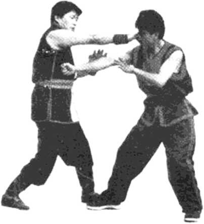 图339【例1】外帘横拍掌直 拳。双方对峙准备格斗(见 图338);乙方以右冲拳向甲 方上路进攻,这时甲方摆步 向乙方右侧移一步,间时用 左拍手拍乙方右冲拳外帘的 桥上,然后左拍手下按,身 体右转出右直拳猛击在乙方 胸部上或脸上(见图339)。