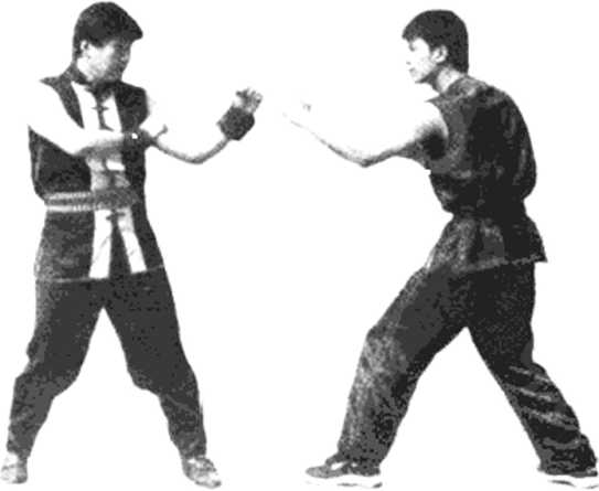 【例2】内帘横拍打直 拳。双方对峙准备格斗(见 图340);乙方用左冲拳向甲方中路迸攻,甲方即以左拍掌 拍打乙方左拳的内帘,突然下按并以右冲拳直打乙方的胸部