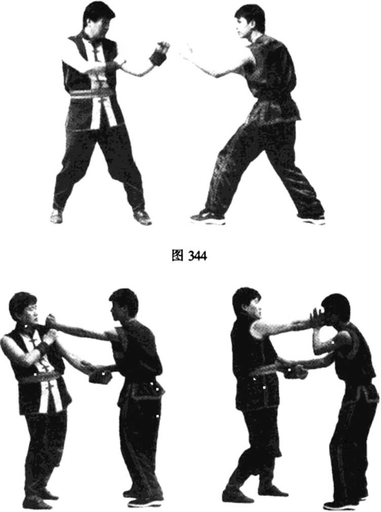 【例3】横拍掌与子午拳。双 方对峙准备格斗(见图344);甲 方用左拳向乙方中路进攻,乙方 立即以右手拍接;当接到甲方右 拳时及时下按,同时左拳迅速猛 图341