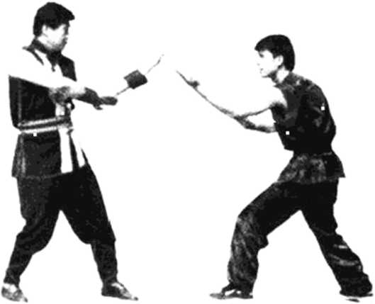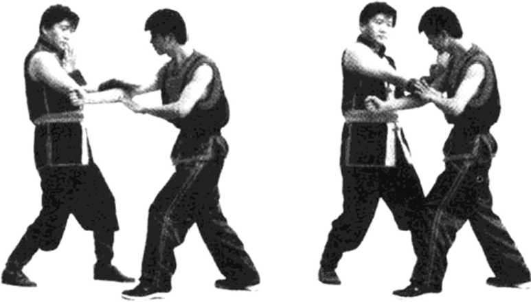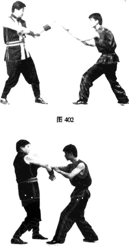 双方对峙准备格斗(见图 402);乙方上步以右直拳向甲方上路进攻,甲方即以右膀手