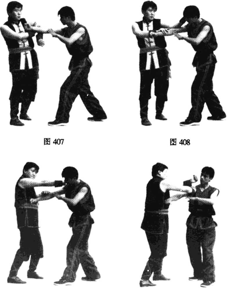 图409图410408);当用右手直砍对手脸部时,手肘可及时顶乙方的右 肩,并出左直拳猛打乙方的脸部(见图409、图410)。