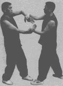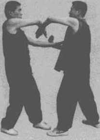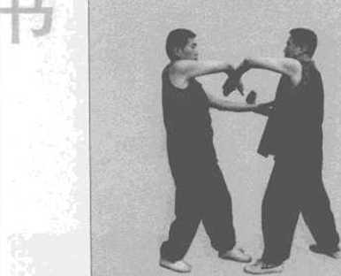 双人以钳阳马对峙(图3-43),乙方以右拳向甲方的胸部攻击甲方即以左内帘摊手接招。当甲方摊住乙方冲拳时乙方右冲拳手即化伏手伏住甲方的左摊手。这时甲方以右冲拳打向乙方的胸部乙方左摊手摊住甲方右冲拳手。当甲方的右冲拳被乙方摊住时甲方的右冲拳手即化伏手伏在乙方的摊手上。该姿势是初学双黏手规定手法之一(图3-44)