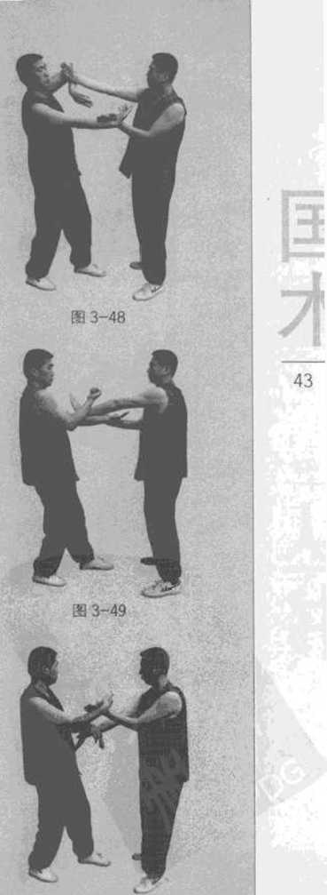 1 甲乙双方各做辘手三次即左手摊膀摊、右手膀摊膀后再归回双黏手势(图3-45-图3-47)