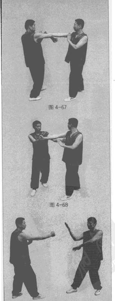 乙方以右直拳向甲方上路攻击。甲方以右膀手抢内帘招架(图4-67)