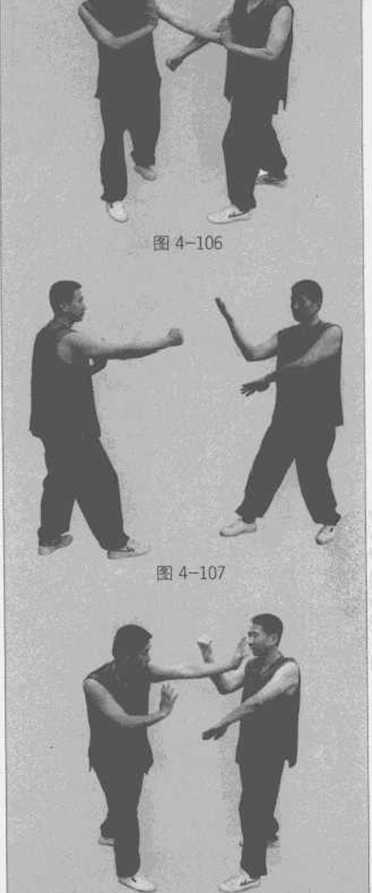 乙方用右直拳向甲方上路进攻。甲方即以左手拦截乙方的来拳同时以内圈手运腕劲耕住乙方的右拳(图4-105)