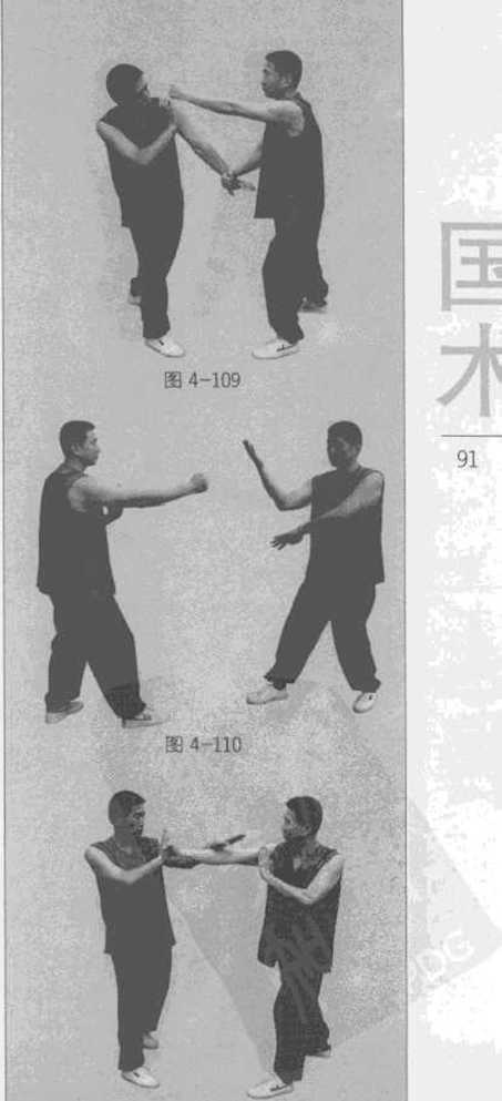 及时下按迫使甲方左手压住自己的右手(成一伏二势)也可直接按手打接拳乙方左拦手变直拳打向甲方的脸部(图4-109)。