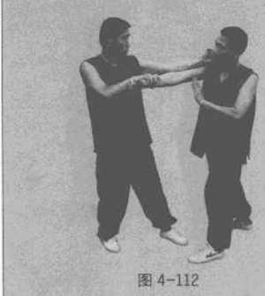 然后立即(圈手)抢位当圈手行半圈后即化直拳直击乙方脸部(图4-112)。