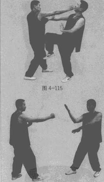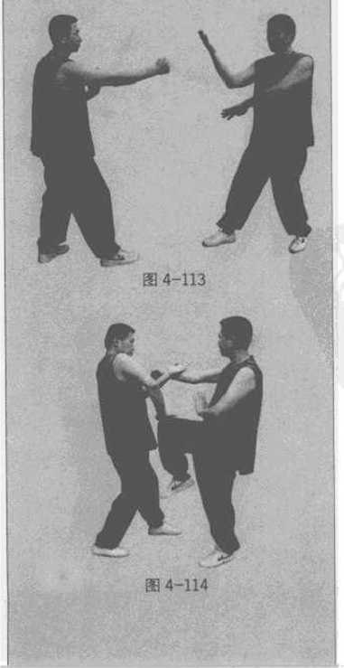 乙方起膝攻击甲方的腹下部。甲方及时左转坐马用右伏掌下按(图4-114)