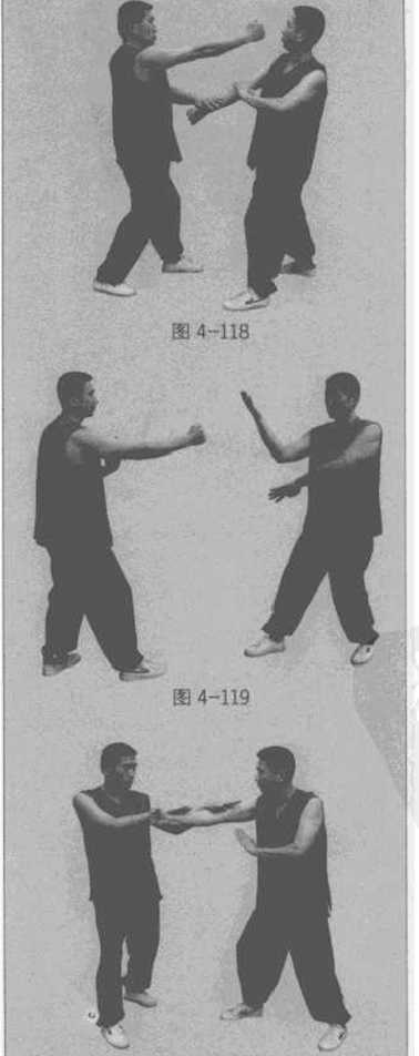乙方以右直拳向甲方进攻。甲方立即以左伏手伏按乙方右拳(图4-117)