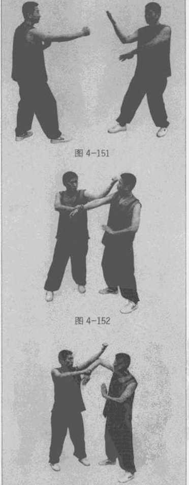 双方对峙准备格斗(图4-145)乙方以右冲拳向甲方上路攻击。甲方同时用左标指手抢内帘向乙方脸部直插右手成护手护在左肩前(图4-146)例6左脱手与右标指双方对峙准备格斗(图4-147)图4-149图4-149图4-149图4-149甲方以右插拳打向乙方的腹部。乙方即以右下按掌防守当按到甲方的右拳时即转锁手锁住甲方来拳的腕部(图4-148)甲方即以左插沙掌(即铲手)去抢脱被锁的手(图4-149)。左手及时化弓箭手封住乙方前锋手右手变标指手以侧指直插乙方面部(图4-150)此招慎用。105105105105