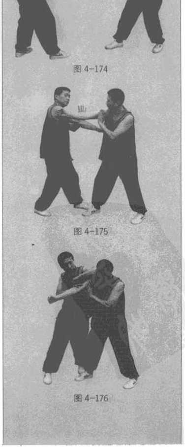 当右拳击中乙方脸部时右手突然向下按住乙方右手肘关节以左横肘攻击乙方的脖子(图4—176)。